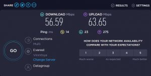 We’ve seen a drop from 56Mbps to 31Mbps in our Download test and from 63Mbps to 33Mbps in an Upload test. Don’t expect those speeds on a free plan, as it is capped at 1Mbps.